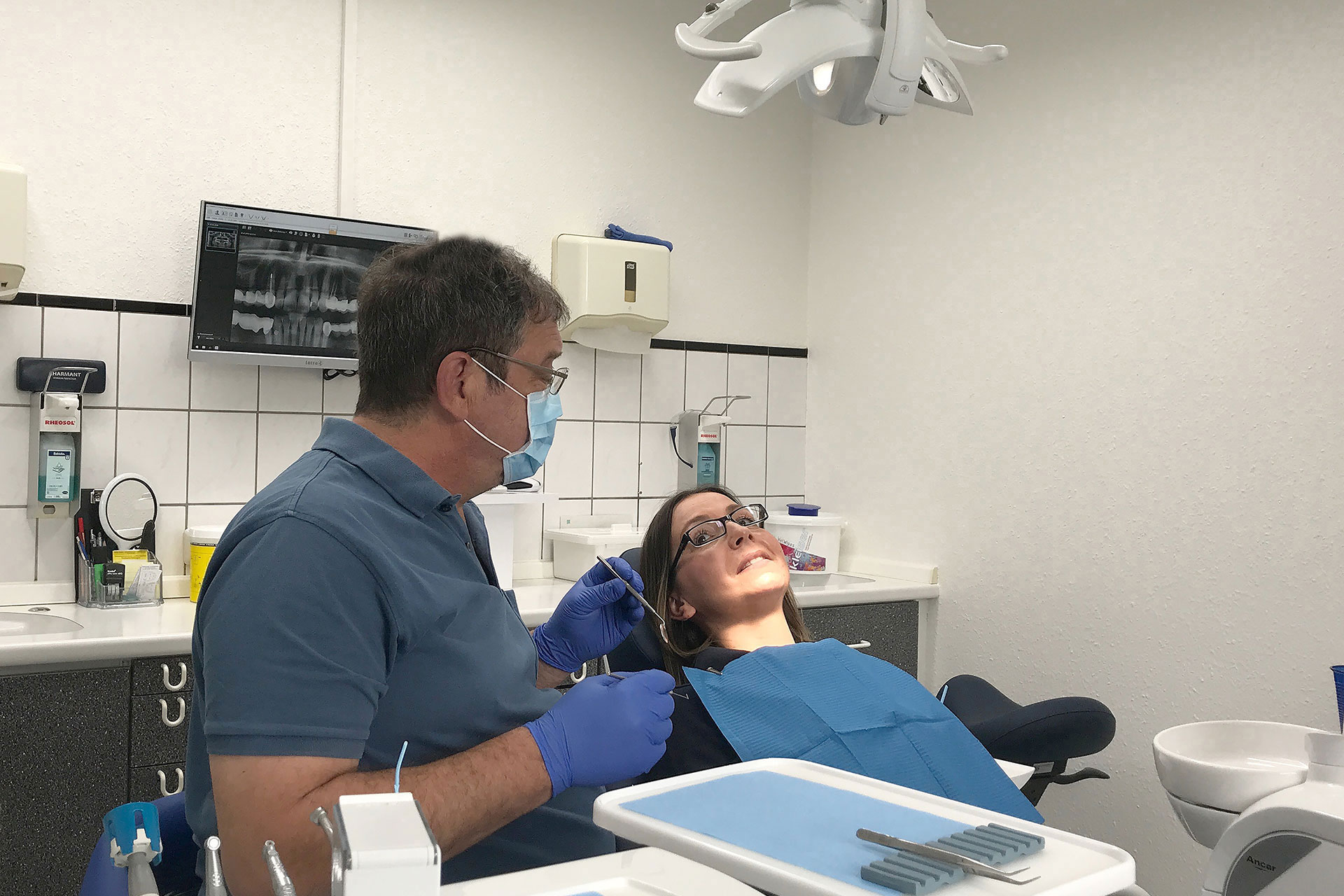 Zahnarzt Axel Schmalhaus, Zahnarzthelferin Ana Christina Felipe da Silva und Empfangsdame Gabi Otte